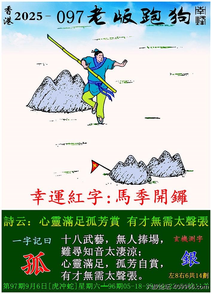 097期老版跑狗一字記之曰:【孤】 詩雲:心靈滿足孤芳賞 有才無需太聲張。