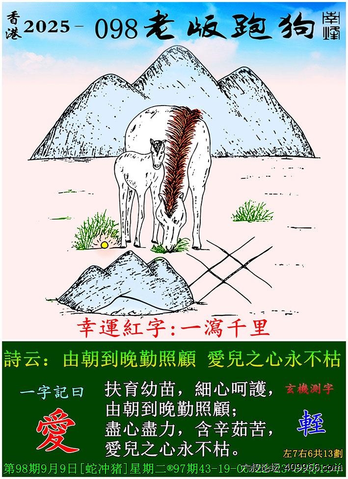 098期老版跑狗一字記之曰:【愛】 詩雲:由朝到晚勤照顧,愛兒之心永不枯。