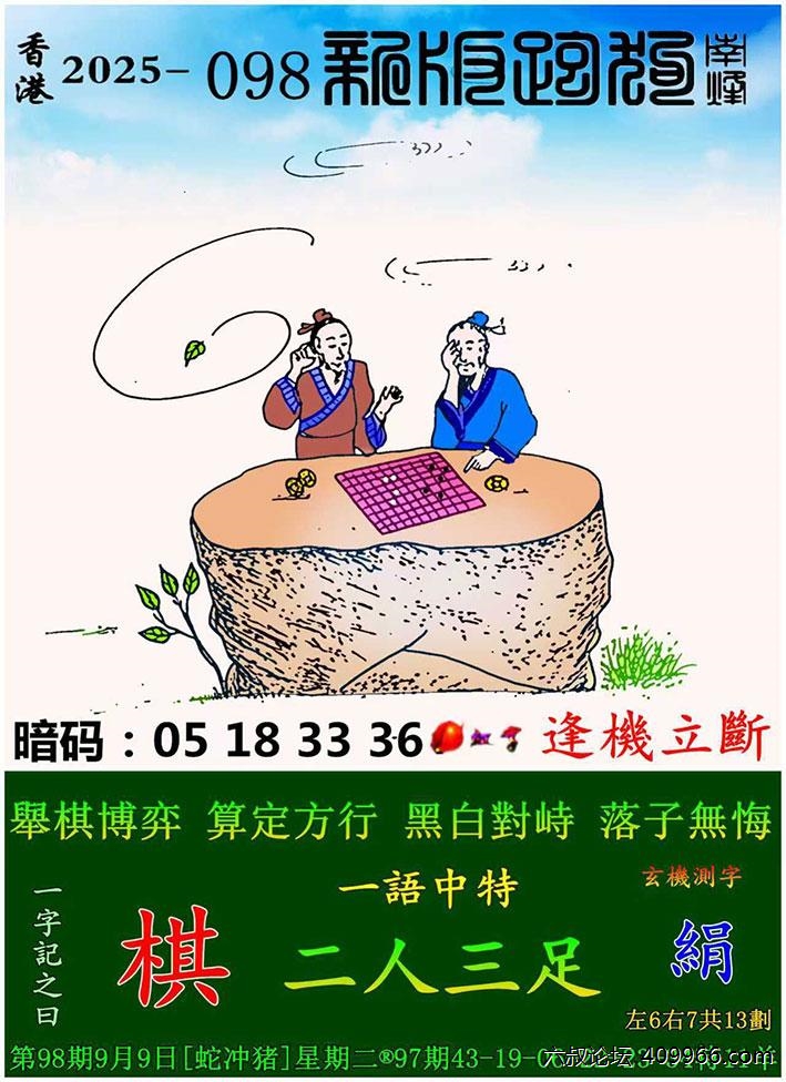 098期新版跑狗一字記之曰:【棋】 玄機測字:《絹》 一語中特:二人三足