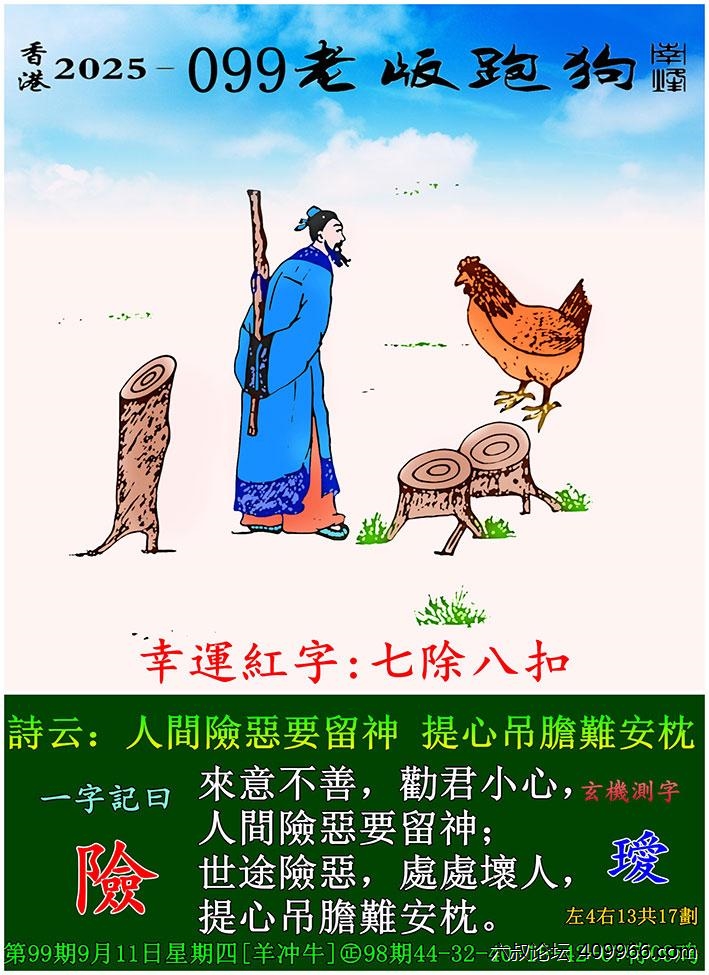 099期老版跑狗一字記之曰:【險】 詩雲:人間險惡要留神,提心吊膽難安枕。