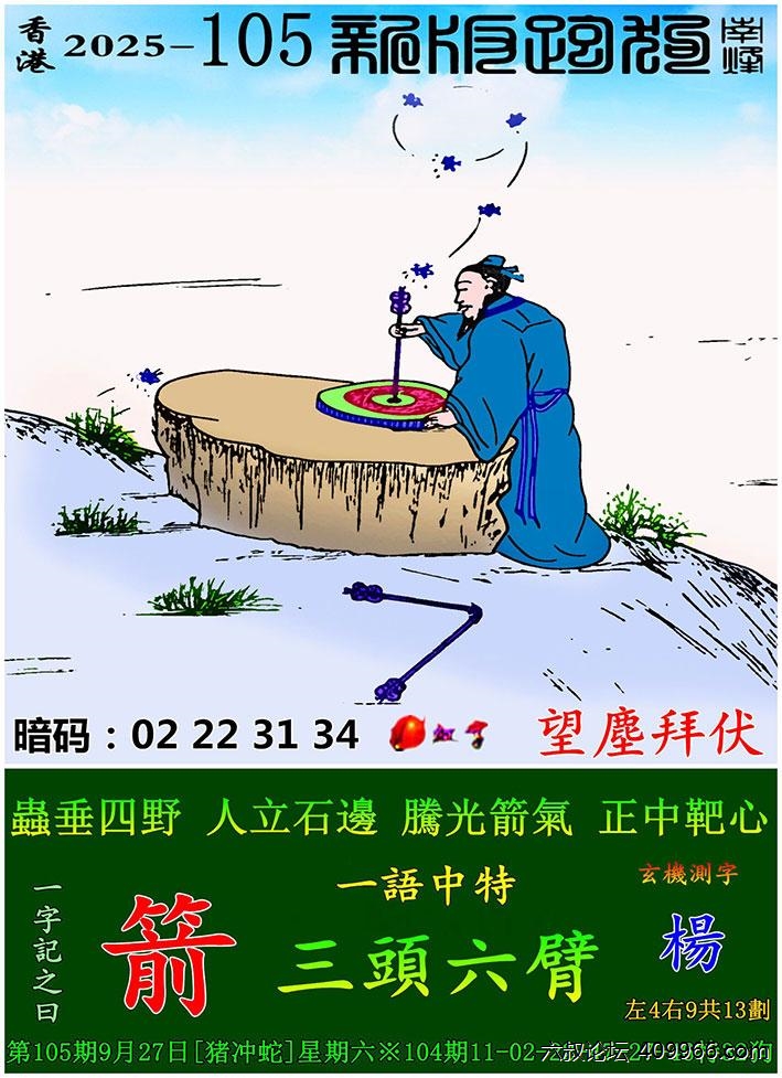 105期新版跑狗一字記之曰:【箭】 玄機測字:《楊》 一語中特:三頭六臂