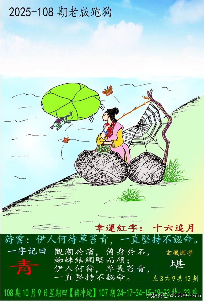 108期老版跑狗一字記之曰:【青】 詩雲:伊人何待草苔青,一直堅持不認命。