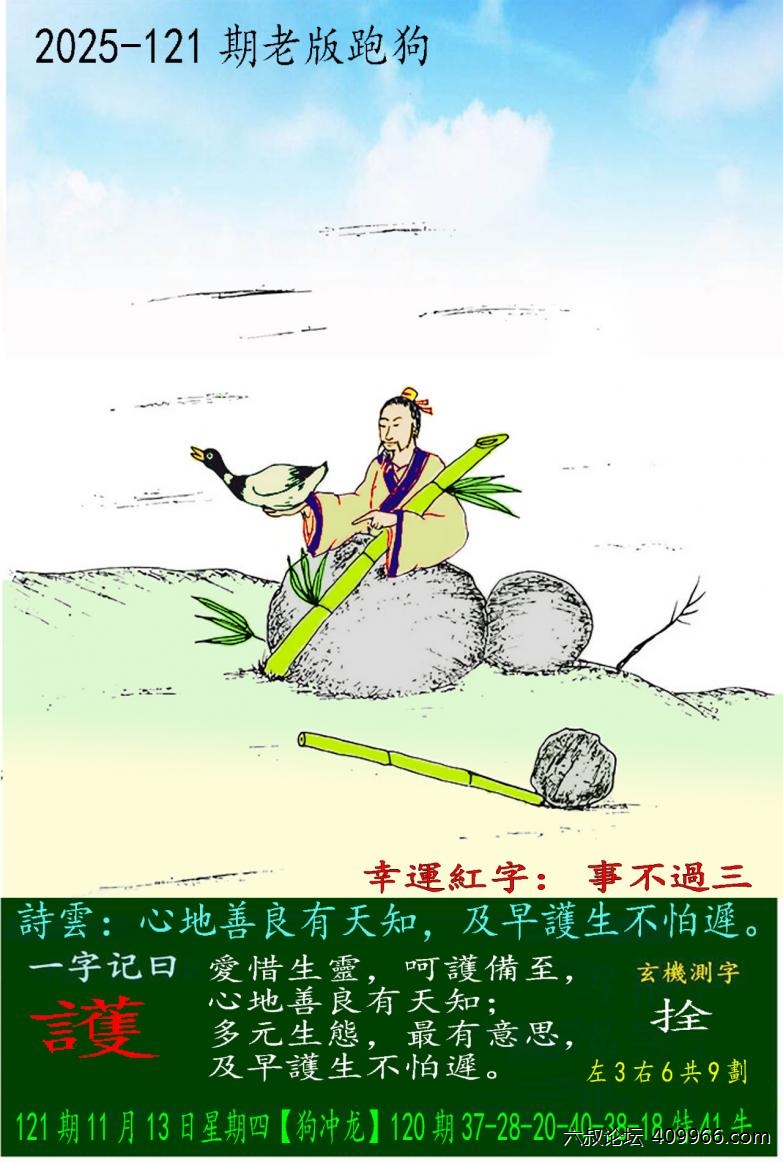 121期老版跑狗一字記之曰:【護】 詩雲:心地善良有天知,及早護生不怕遲。