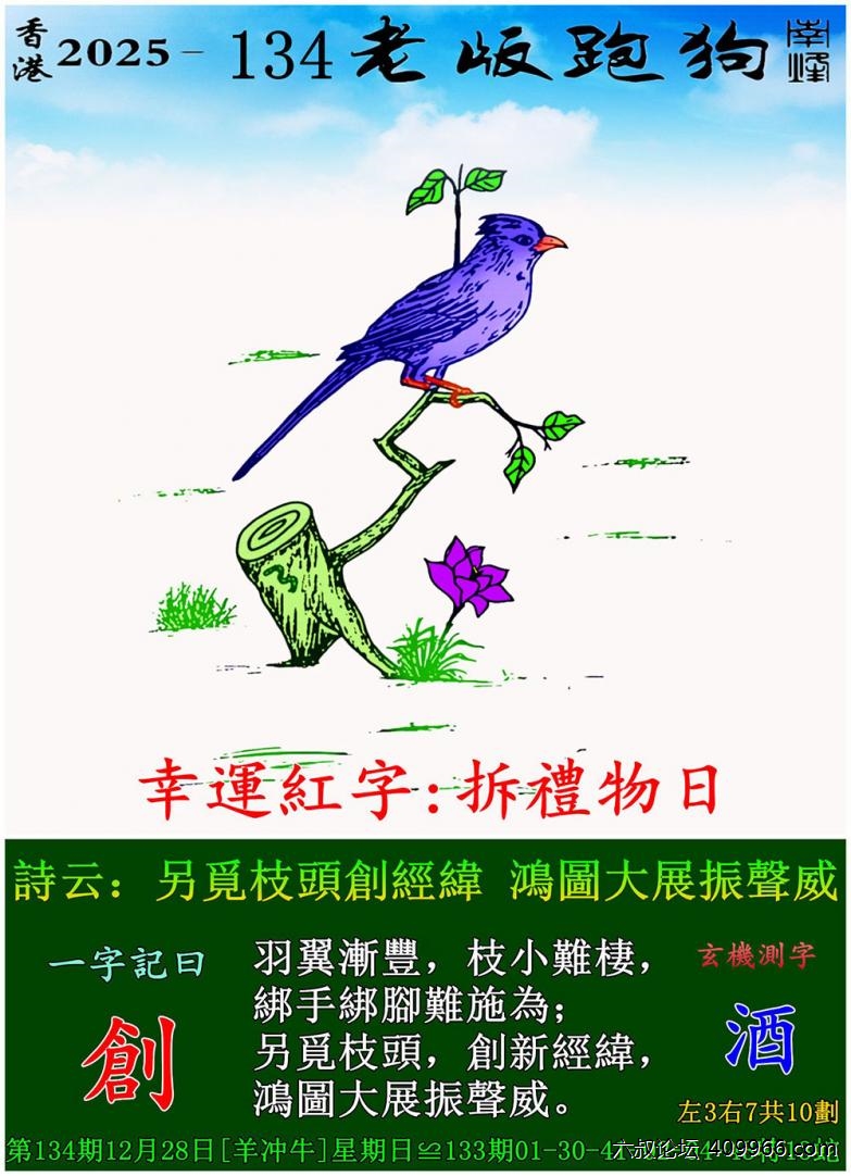 134期老版跑狗一字記之曰:【創】 詩雲:另覓枝頭創經緯,鴻圖大展振聲威。