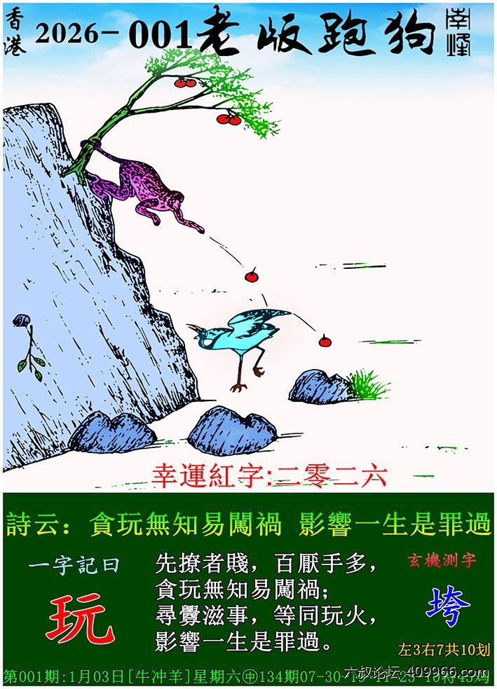 001期老版跑狗一字記之曰:【玩】 詩雲:貪玩無知易闖禍,影響一生是罪過。