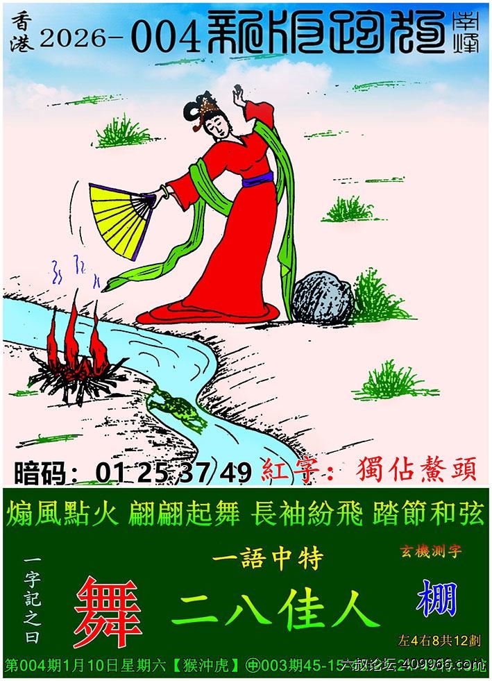 004期新版跑狗一字記之曰:【舞】 《棚》 一語中特:二八佳人