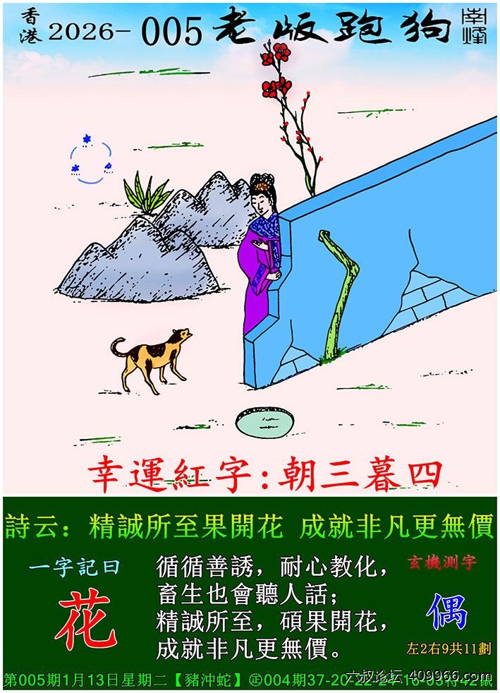 005期老版跑狗一字記之曰:【花】 詩雲:精誠所至果開花,成就非凡更無價。