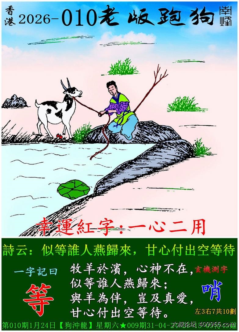 010期老版跑狗一字記之曰:【等】 詩雲:似等誰人燕歸來,甘心付出空等待。