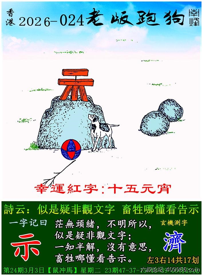 024期老版跑狗一字記之曰:【示】 詩雲:似是疑非觀文字,畜牲哪懂看告示。